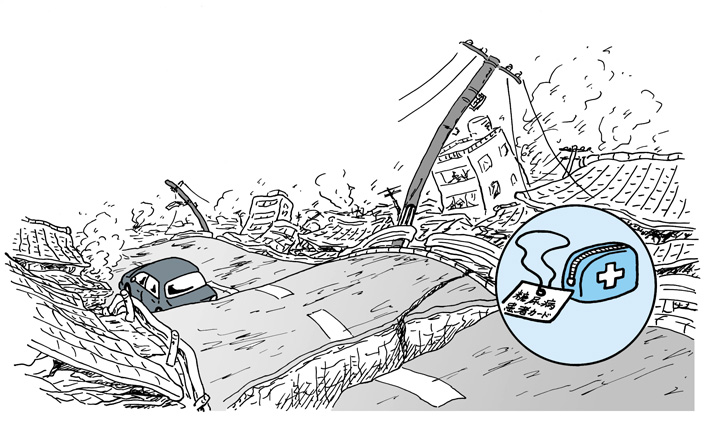 最近頻発している地震,風水害,新型感染症など不慮の災害にも,十分な備えが必要です。とくに毎日使用している血糖自己測定機器や,経口薬,インスリン器材などは,すぐ持ち出せるよう身近に置いてください。