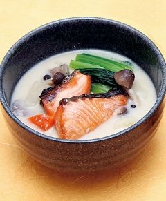 - ④ 鍋にだし汁と、しめじとねぎ以外の①の材料を入れて、火にかける。少し煮たら、しめじとねぎ、②の鮭、③の酒粕をよく溶かして加え、中火で煮る。