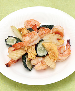 - ③ 同じフライパンに小さじ2の油を入れて中火にかけ、生姜とにんにくとエビを加えて炒め、エビの表面が少し赤くなってきたら、きゅうりとセロリを加える。さっと炒めてから②の卵を加え、ナンプラーとこしょうで味をつけ、皿に盛る。
