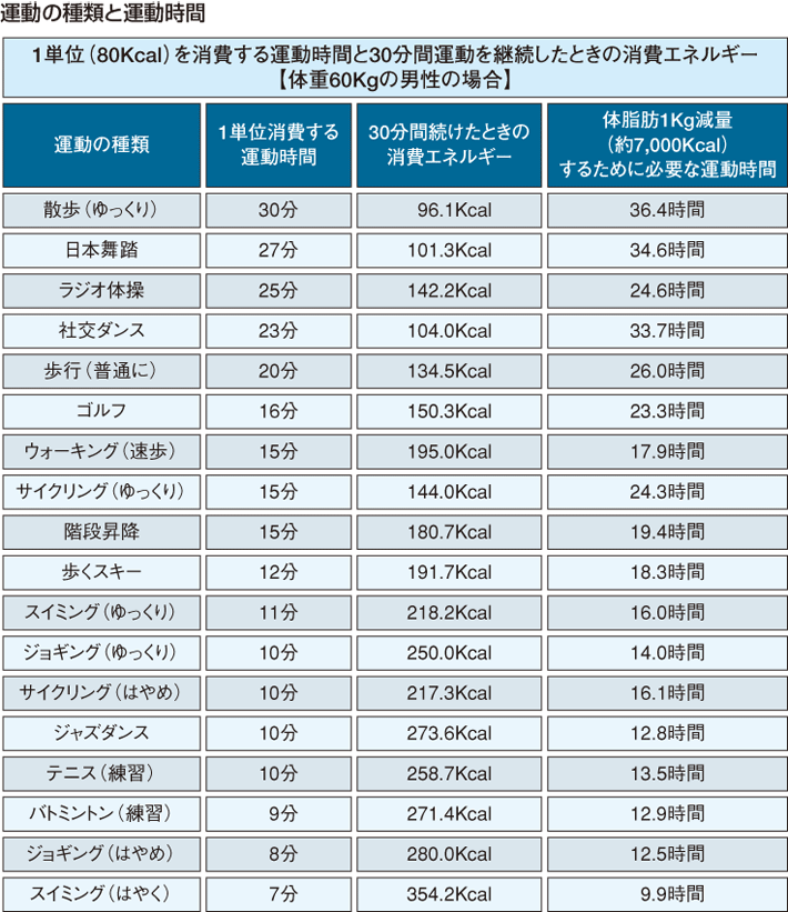 なお運動の種類によるエネルギー消費量の計算式を次ページに示しますが,できるだけ1日160〜200キロカロリー消費する運動量を毎日の生活の中でとりたいものです。