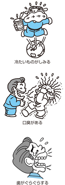 歯周病の症状として次の点があげられます。思いあたる点があったら,すぐに歯科を受診しましょう。 ①冷たいものがしみる。②歯ぐきが赤くはれる。③口臭がある。④歯ぐきから血が出やすい。⑤歯ぐきがぶよぶよする。⑥歯ぐきが縮んでくる。⑦歯ぐきからうみが出る。⑧歯がぐらぐらする。