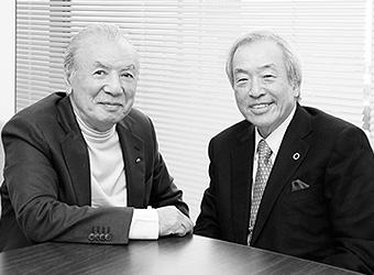 対談中の渡辺貞夫さん(左)と堀田編集委員長